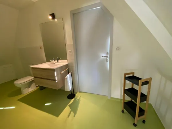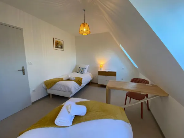Gîte indépendant, sur 2 niveaux, dans un village, près de l’église (les cloches sonnent de 7h à 22h), en campagne. Au rez-de-chaussée : coin-cuisine (lave-vaisselle) – salon (canapé, télévision, poêle à granulés, accès internet/wifi), salle d’eau (1 vasque, douche, wc, lave-linge), 1 chambre (1 lit 160). Au 1er étage mansardé : 1 chambre (1 lit 140), 1 chambre (2 lits 90), salle de bain (1 vasque, baignoire d’angle, wc). Chauffage par poêle à granulés au rez-de-chaussée (granulés fournis) et par radiateurs électriques à l’étage. Salon de jardin, plancha gaz, terrasse privée (36m²), terrain privé clos (400m²), garage privé (accessible uniquement pour vélos, motos), parking privé. Chauffage/électricité inclus. Draps (lits faits à l’arrivée) et de linge de toilette fournis. Option ménage fin de séjour (50€) – Chaise haute et lit bébé. Le rez-de-chaussée est accessible aux personnes à mobilité réduite.